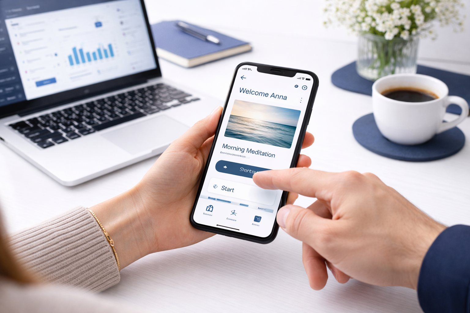 Ik verdiep me in je visie en samen ontwikkelen we een duidelijke, eenvoudige app waarin je cliënten al je inhoud altijd en overal kunnen raadplegen. Je meditaties, cursussen en impulsen krijgen een vaste plek – overzichtelijk, rustig en gemakkelijk toegankelijk.