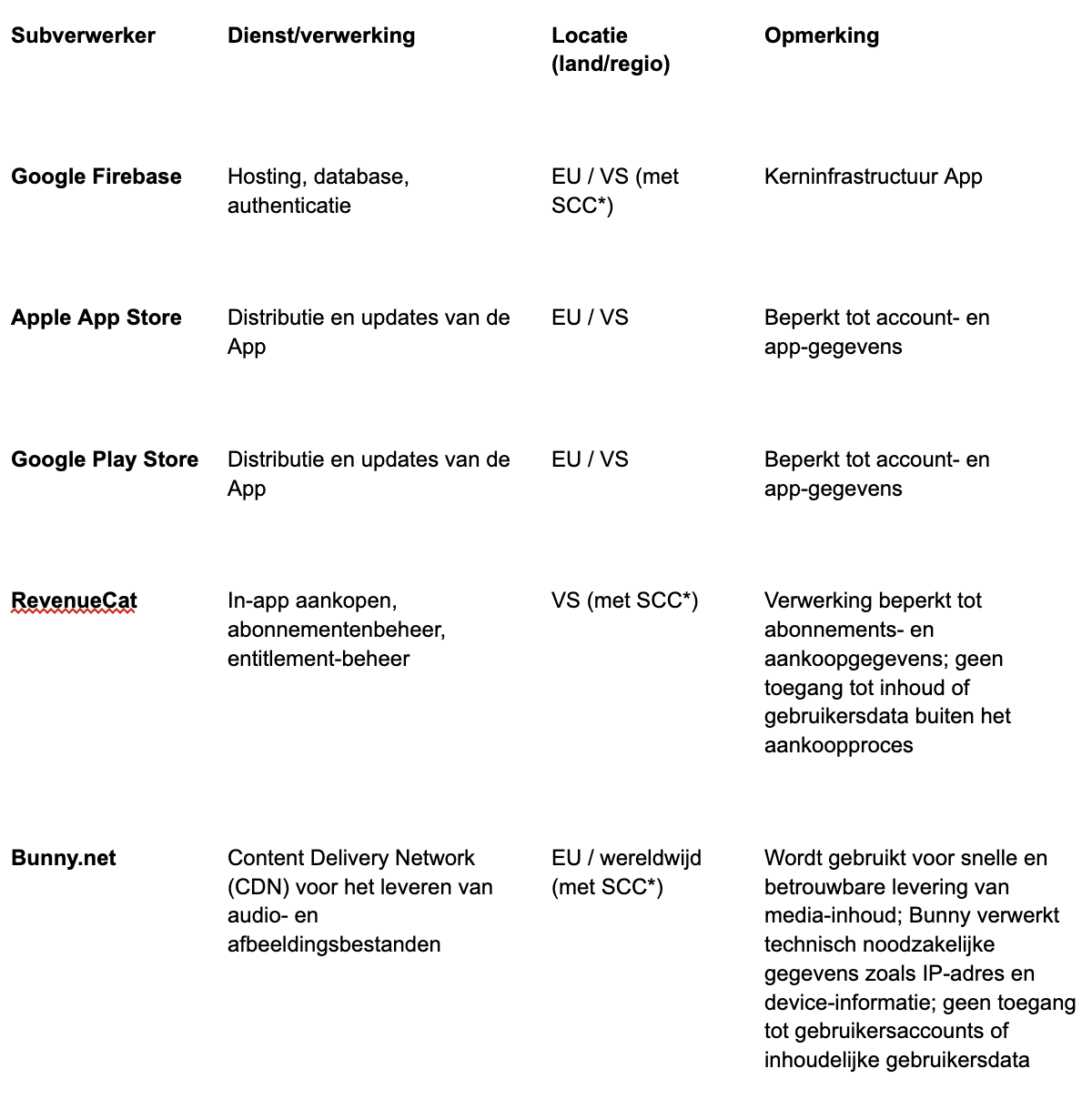 4.1 Opdrachtnemer mag bij de uitvoering gebruikmaken van subverwerkers (zoals hostingproviders, clouddiensten, appstores en API-aanbieders), mits deze een vergelijkbaar beschermingsniveau waarborgen.